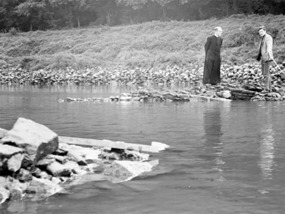 Hier in Elsloo is een compleet middeleeuws kasteel opgeslokt door de Maas. Bij extreem lage waterstand kun je sommige bouwstenen nog gewoon zien liggen. Dat gebeurde ook in 1969 en amateur-archeoloog pater Munsters zag kans om het een en ander te documenteren.